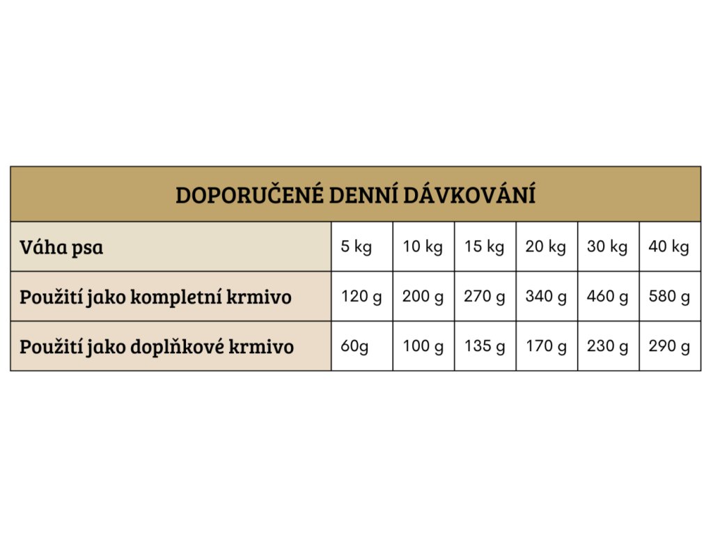 Složení: 97 % kachna (jemná svalovina z kachny včetně prsou, kachní srdce, kachní játra), 2 % hnědá rýže, 1 % vitamíny a minerály.
