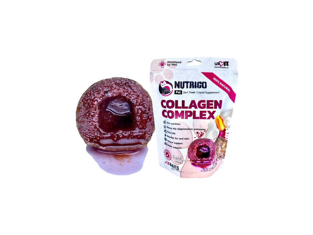 První a jedinečný doplněk výživy svého druhu ve světě, který kombinuje superpotraviny s tekutou účinnou látkou uvnitř chutného pamlsku. NUTRIGO Collagen Complex představuje unikátní složení sirupu pro podporu kloubní a svalové výživy vašeho psa uvnitř chutného sousta v podobě lákavého pamlsku. Dochází tak k okamžitému vstřebání účinných látek a může velmi rychle pomoci s pohybovými nebo kloubními problémy. NUTRIGO Collagen Complex poskytuje zvířeti všechny nezbytné složky pro dobrý stav kloubní chrupavky. NUTRIGO Collagen Complex mohou denně užívat všichni, jako prevenci zdraví pohybového ústrojí, pro podporu ve vysoké zátěži psa nebo při prvních známkách ztuhlosti kloubů. NUTRIGO Collagen Complex je chutný doplněk stravy, který bude váš parťák přijímat s radostí, skvěle si pochutná a nezatíží trávicí trakt. NUTRIGO Collagen Complex pomůže udržet vašeho pejska v pohybu a životní pohodě po celý den zklidněním ztuhlých kloubů, podporou kloubní struktury, mobility a imunity.