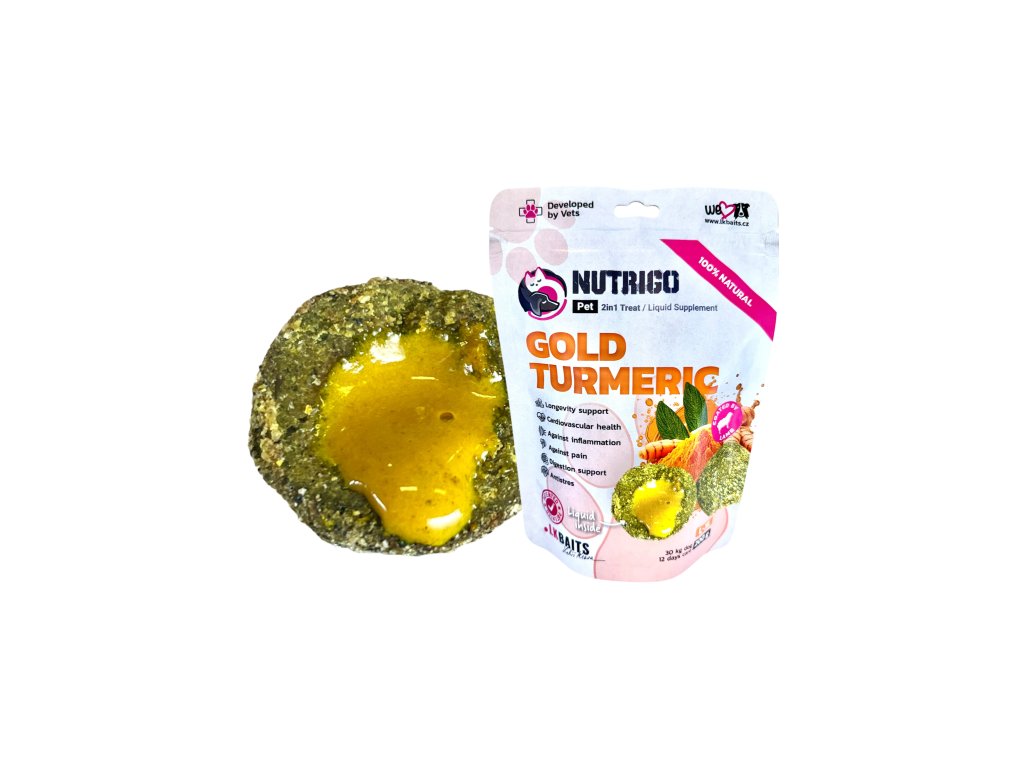 První a jedinečný doplněk výživy svého druhu ve světě, který kombinuje superpotraviny s tekutou účinnou látkou uvnitř chutného pamlsku. NUTRIGO Gold Turmeric představuje unikátní složení přírodního sirupu pro podporu dlouhověkosti, trávení, kardiovaskulárního zdraví, zdravé mozkové aktivity a také pomáhá k potlačení chronického zánětu a bolesti. Společně s extraktem černého pepře, skořicí a kvalitním tukem dochází k okamžitému vstřebání účinných látek. NUTRIGO Gold Turmeric mohou denně užívat všechny věkové skupiny psů, ale velký benefit je znám u starších psů. Tip.: Doporučujeme kombinovat 1:1 s NUTRIGO CBD Kanabidiol.