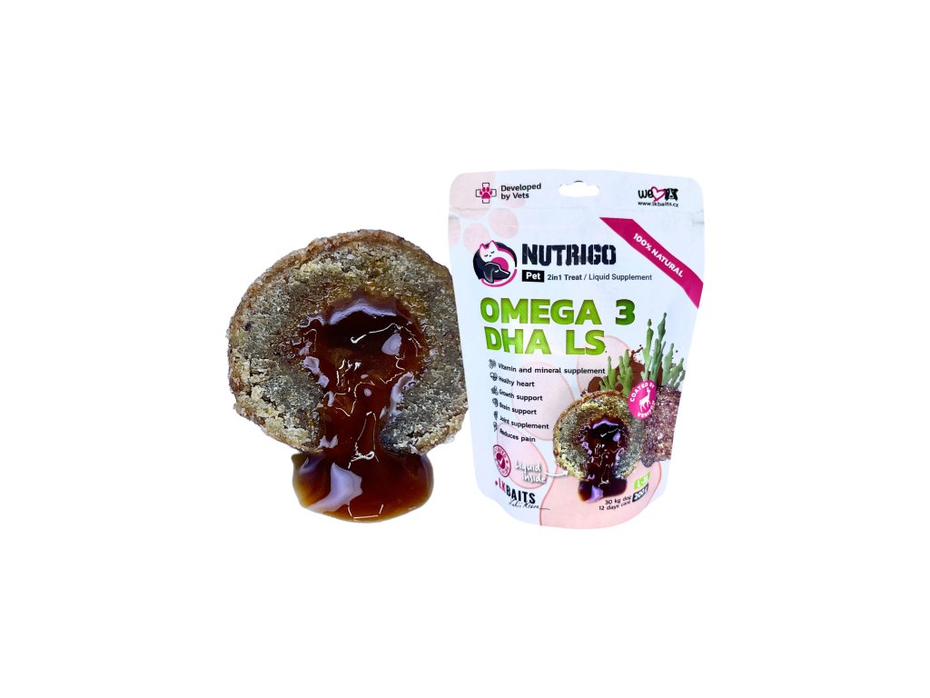 První a jedinečný doplněk výživy svého druhu ve světě, který kombinuje superpotraviny s tekutou účinnou látkou uvnitř chutného pamlsku. NUTRIGO Omega-3 DHA LS představuje unikátní složení omega-3 mastných kyselin s dlouhým řetězcem. Jejich přínosy jsou celosvětově prokázány a uznávány jako zdraví prospěšná nutriční složka v zvířecí stravě. Omega-3 mastné kyseliny jsou nezbytným zdrojem živin a hrají klíčovou roli v otázce zdraví našich domácích mazlíčků. Díky naší technologii NUTRIGO implementujeme Algae DHA LS PRIME přímo dovnitř pamlsku, což zaručuje snadný příjem a vysokou míru vstřebání potřebných látek. NUTRIGO Omega-3 DHA LS pomáhá udržovat zdraví srdce, mozku, očí a může pozitivně podporovat organismus během růstu, vývoje a reprodukce. Jeden pamlsek střední velikosti S-M obsahuje až 499 mg DHA + 268 mg EPA!