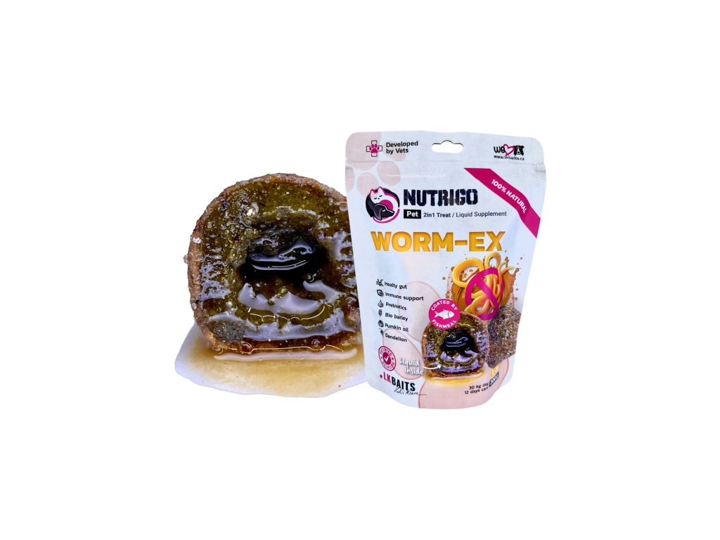 První a jedinečný doplněk výživy svého druhu ve světě, který kombinuje superpotraviny s tekutou účinnou látkou uvnitř chutného pamlsku. NUTRIGO WORM-EX je doplněk výživy založen na směsi tekutého výtažku bylin, který podporuje lepší kondici střeva a pomáhá znepříjemnit podmínky pro uchycení parazitů. Díky naší Nutrigo technologii si pes na pamlsku pochutná (snadný příjem) a bylinný sirup uvnitř chutného sousta se tak rozpustí přesně tam, kde je potřeba. Dochází tak k okamžitému vstřebání účinných látek a vytvoření právě takového prostředí ve střevu, které není komfortní pro střevní parazity. NUTRIGO WORM-EX tak napomáhá k vyloučení červů z těla ven 100% přírodní cestou, a to zcela bez chemie, umělých aromat a barviv (přípravek parazity nezabíjí). NUTRIGO WORM-EX obsahuje také doplněk detoxikačních látek s obsahem vitamínů, minerálů a přírodních výtažků, které podporují celkovou imunitu.NUTRIGO WORM-EX obsahuje extrakt z BIO ječmene pocházejícího z Nového Zélandu, který působí jako všeobecné tonikum (látka podporující organismus, působící regeneračně). Posiluje přirozenou ochranu proti virovým a parazitárním onemocněním. NUTRIGO WORM-EX není pro organismus toxický, jako tomu je u klasický chemických prostředků na odčervení!