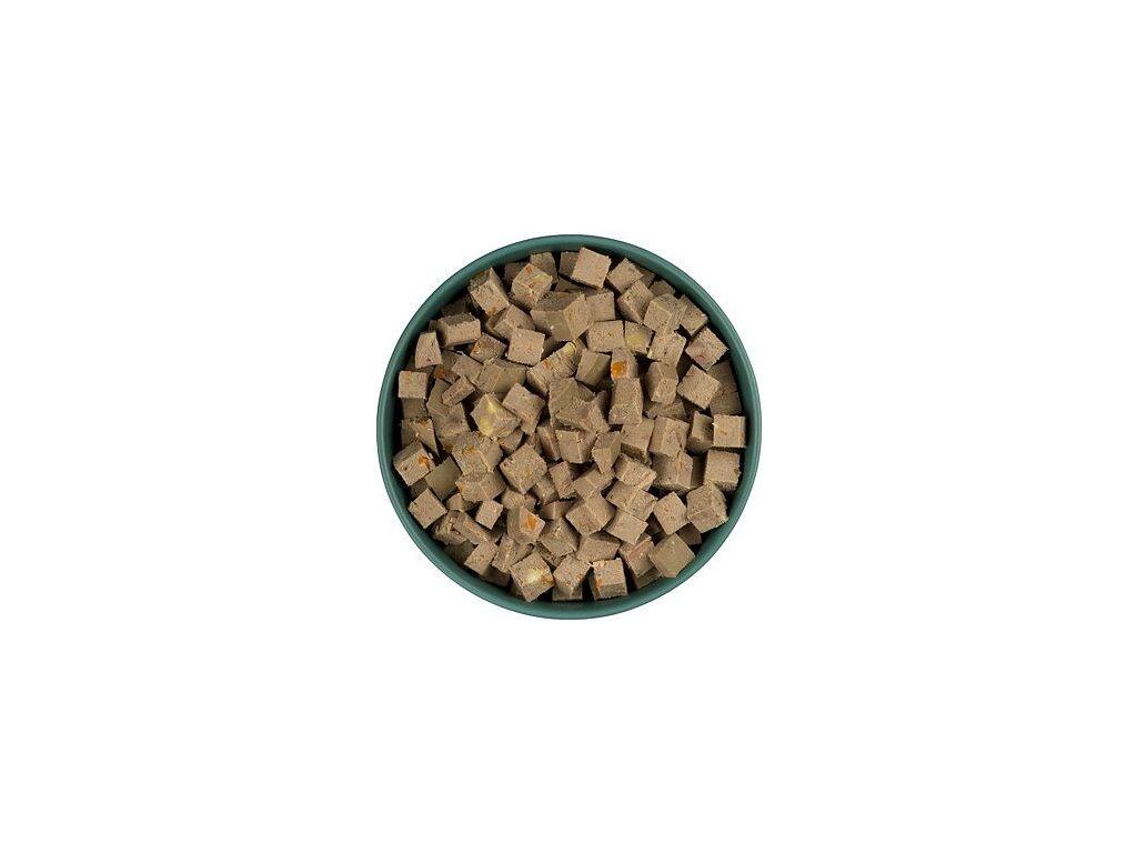 Složení: jehněčí maso a jehněčí vnitřnosti 90%, mrkev 4,8%, hrášek 2%, lněné semínko1,2%, minerály 1%, vápenec 1%