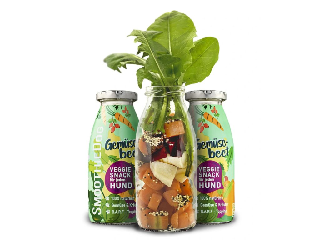 Vegetariánské psí smoothie poskládané z dobrot přímo ze zeleninového záhonu obsahuje spoustu mrkve, dýně, červené řepy, kořenové petržele, lněného semínka, šípku, kurkumy, tymiánu a sušené pampelišky. Toto smoothie najde mnoho nadšených fanoušků a dává psím rodičům dobrou alternativu psí svačiny bez masa.