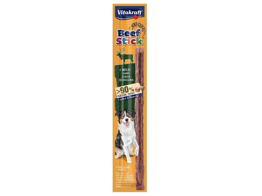 Dopřejte svému mazlíčkovi skutečnou lahůdku – sáhněte po Beef Stick se zvěřinou od značky Vitakraft. Delikátní tyčinka potěší každého pejska. Je z více jak 90 % vyrobená z masa (vepřové, hovězí, drůbež, zvěřina). Najdete v ní také důležité vitaminy. Neobsahuje žádný cukr, barviva, ani konzervační látky či zvýrazňovače chuti. Ať už chcete svého parťáka odměnit nebo mu jen zpestřit jídelníček, tyčinka Beef Stick je tou pravou volbou.